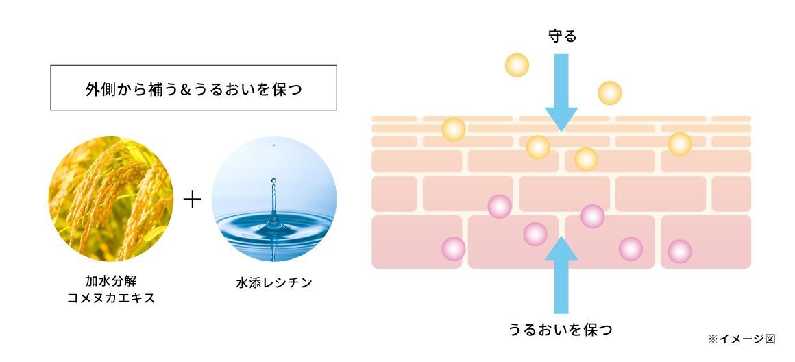 温泉水、水、トリ(カプリル酸/カプリン酸)グリセリル、グリセリン、カミツレ水、 ハッカ水、クエン酸ステアリン酸グリセリル、ペンチレングリコール、オリーブ果実油、ステアリン酸ポリグリセリル-2、ステアリン酸グリセリル、アルブチン、アスコルビン酸、アスコルビルグルコシド、ヒアルロン酸Na、サッカロミセス/ハトムギ種子発酵液、乳酸桿菌/ハイビスカス花発酵液、加水分解コメヌカエキス、セラミドNP、セラミドNG、セラミドAP、セラミドAG、セラミドEOP、マンゴー果実エキス、レモングラスエキス、セイヨウハッカ葉エキス、ゼニアオイ花エキス、カニナバラ果実エキス、ビルベリー葉エキス、マヨラナ葉エキス、ローズマリー葉エキス、ツボクサ葉エキス、カミツレ花エキス、セイヨウネズ果実エキス、ユキノシタエキス、イチジク樹皮エキス、ヒマワリ種子油、ステアリルアルコール、カラギーナン、キサンタンガム、水添ナタネ油アルコール、クエン酸Na、ベンジルアルコール、BG、アルギニン、エタノール、デヒドロ酢酸、フィチン酸、酸化鉄、水添レシチン、アラビアゴム、フィトステロールズ、トコフェロール、香料