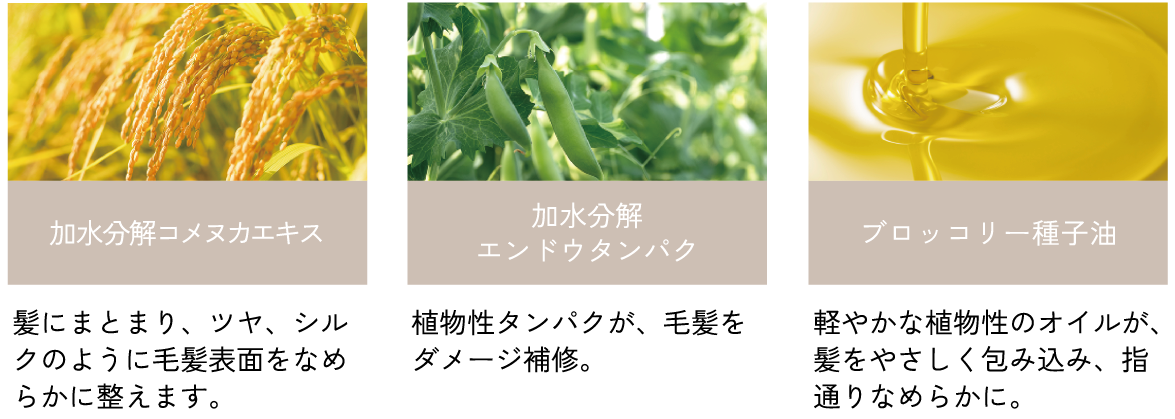 水、グリセリン、セタノール、加水分解水添デンプン、ソルビトール、トリ(カプリル酸/カプリン酸)グリセリル、ステアリルアルコール、 カミツレ水、 ハッカ水、温泉水、 サッカロミセス/ハトムギ種子発酵液、乳酸桿菌/ ハイビスカス花発酵液、加水分解エンドウタンパク、加水分解コメヌカエキス、セラミドNP、セラミドNG、セラミドAP 、ブロッコリー種子油、アルガニアスピノサ核油、ツバキ種子油、マンゴー果実エキス、レモングラスエキス、セイヨウハッカ葉エキス、ゼニアオイ花エキス、カニナバラ果実エキス、ビルベリー葉エキス、マヨラナ葉エキス、オクチルドデカノール、ベヘントリモニウムクロリド、グアーヒドロキシプロピルトリモニウムクロリド、ステアルトリモニウムクロリド、ジステアロイルエチルジモニウムクロリド、イソプロパノール、セテアリルアルコール、デヒドロ酢酸Na、ポリクオタニウム-7、デヒドロ酢酸、塩化Na、リン酸K、BG、 リン酸2Na、エタノール、ベンジルアルコール、水添レシチン、フィトステロールズ、香料